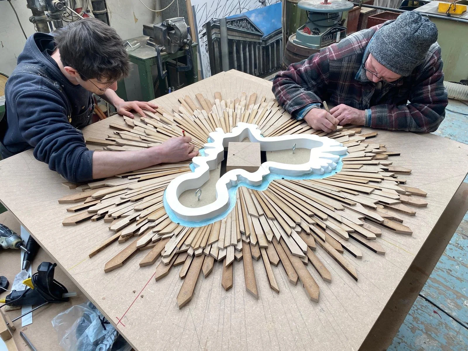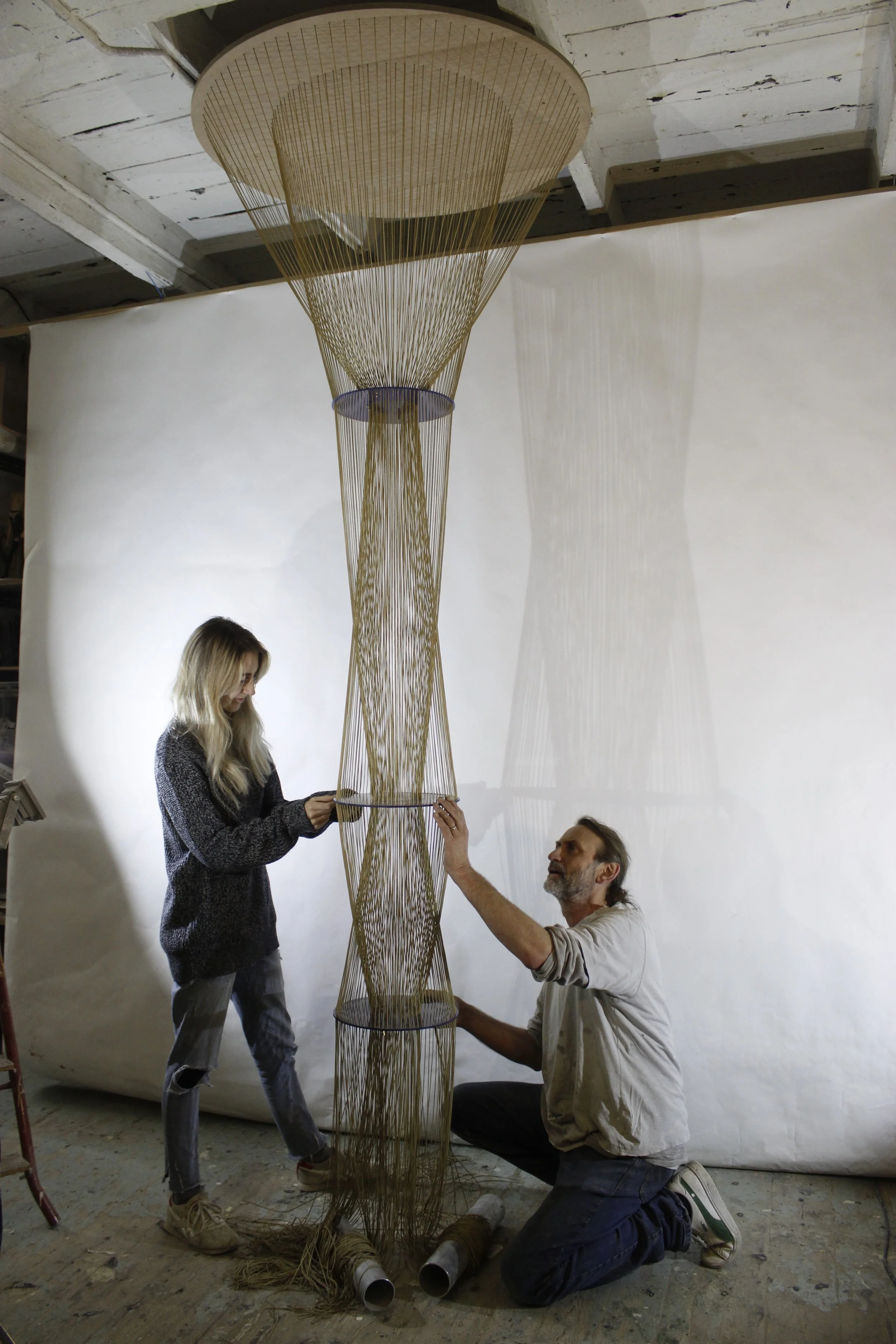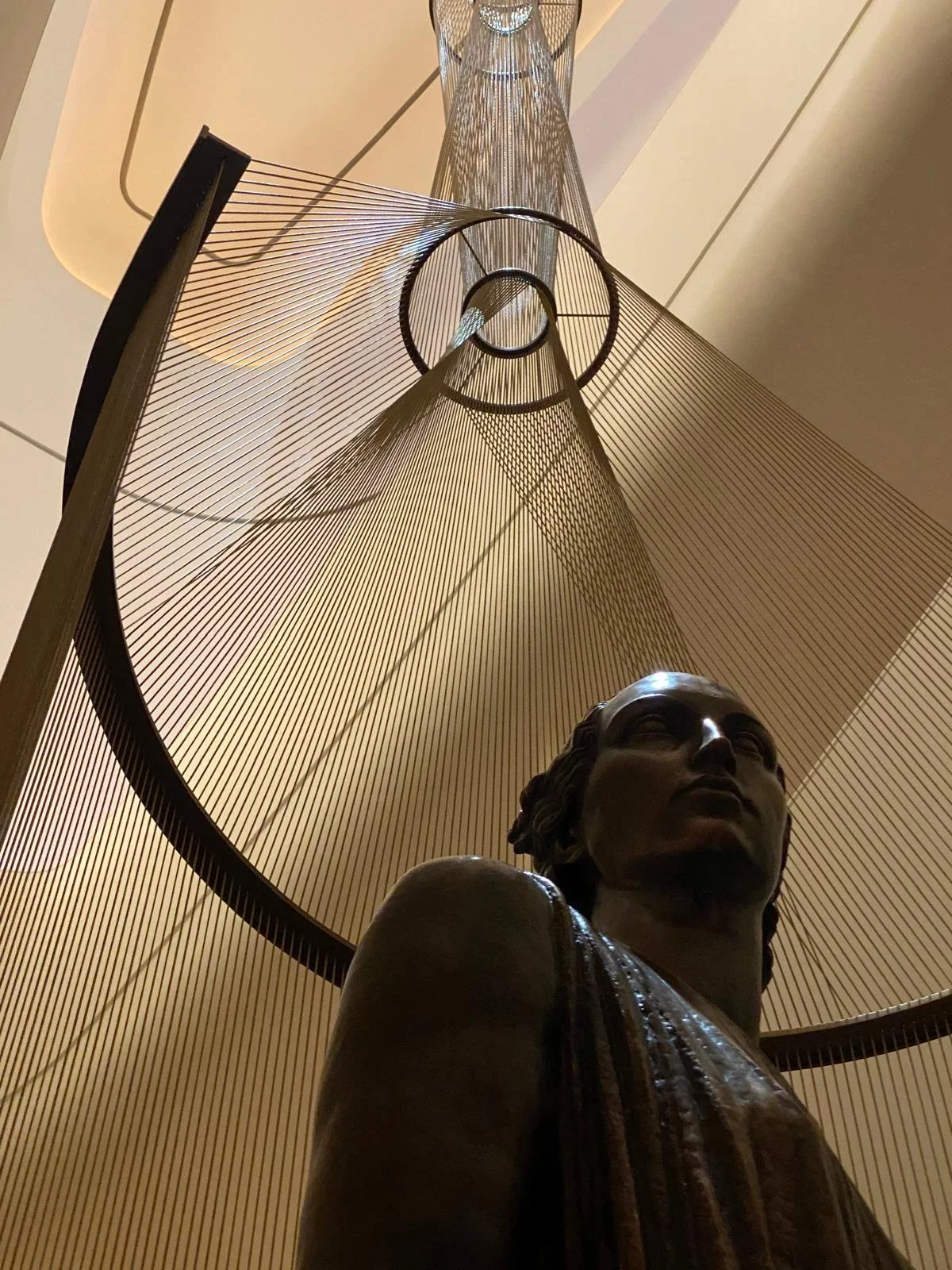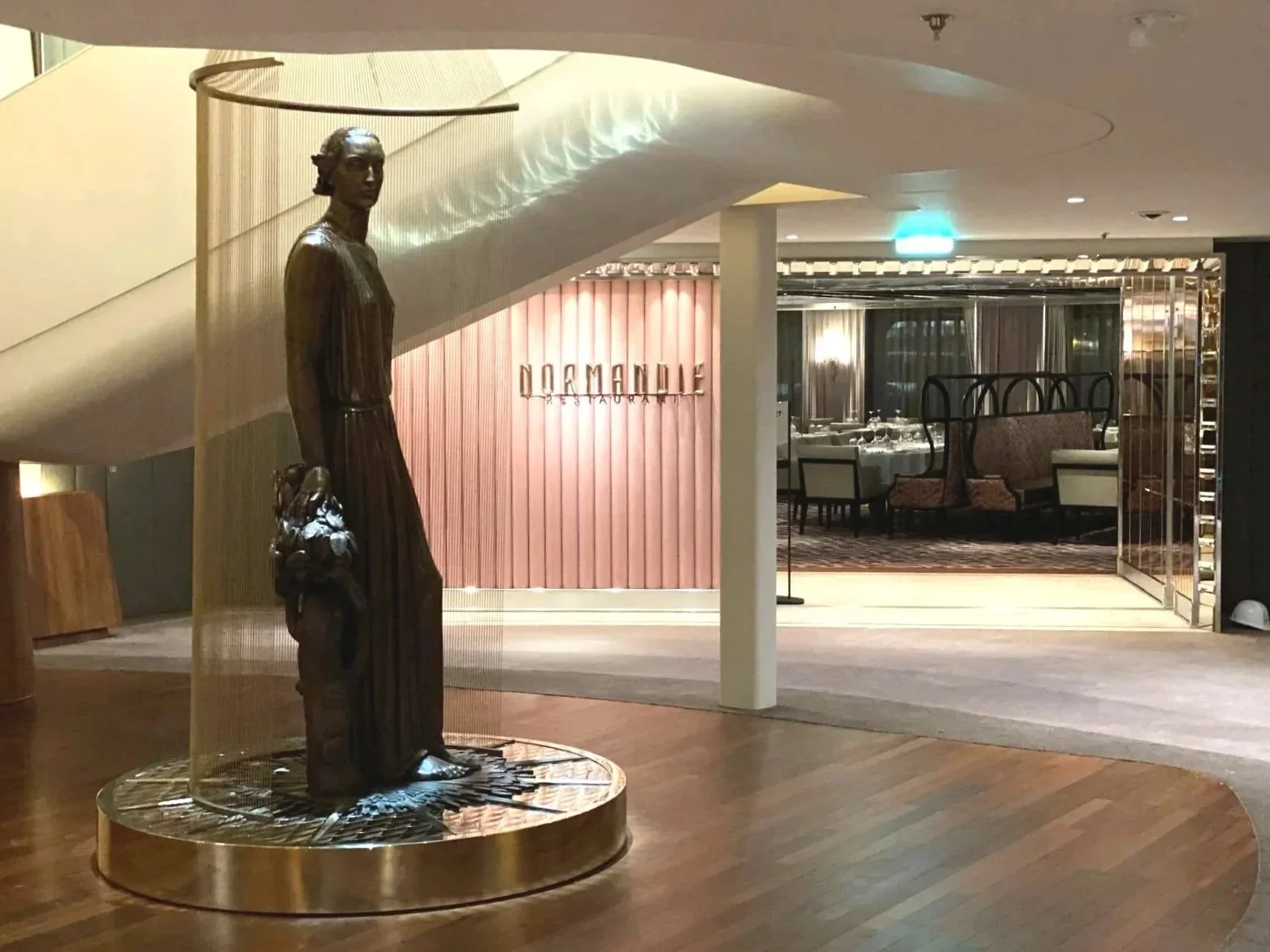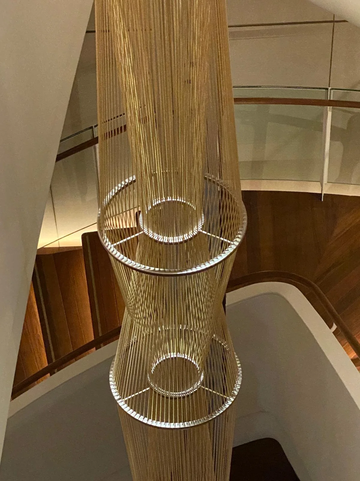An original bronze statue rescued from the depths of the sea, the Lady Normandie was to be reimagined on a new art deco base that perfectly interlocked around the original footprint. A complex pattern of gold chord runs from floor to ceiling running through tiered disks. Each step of this project was carefully measured and tested for this installation’s longevity inside a ship.